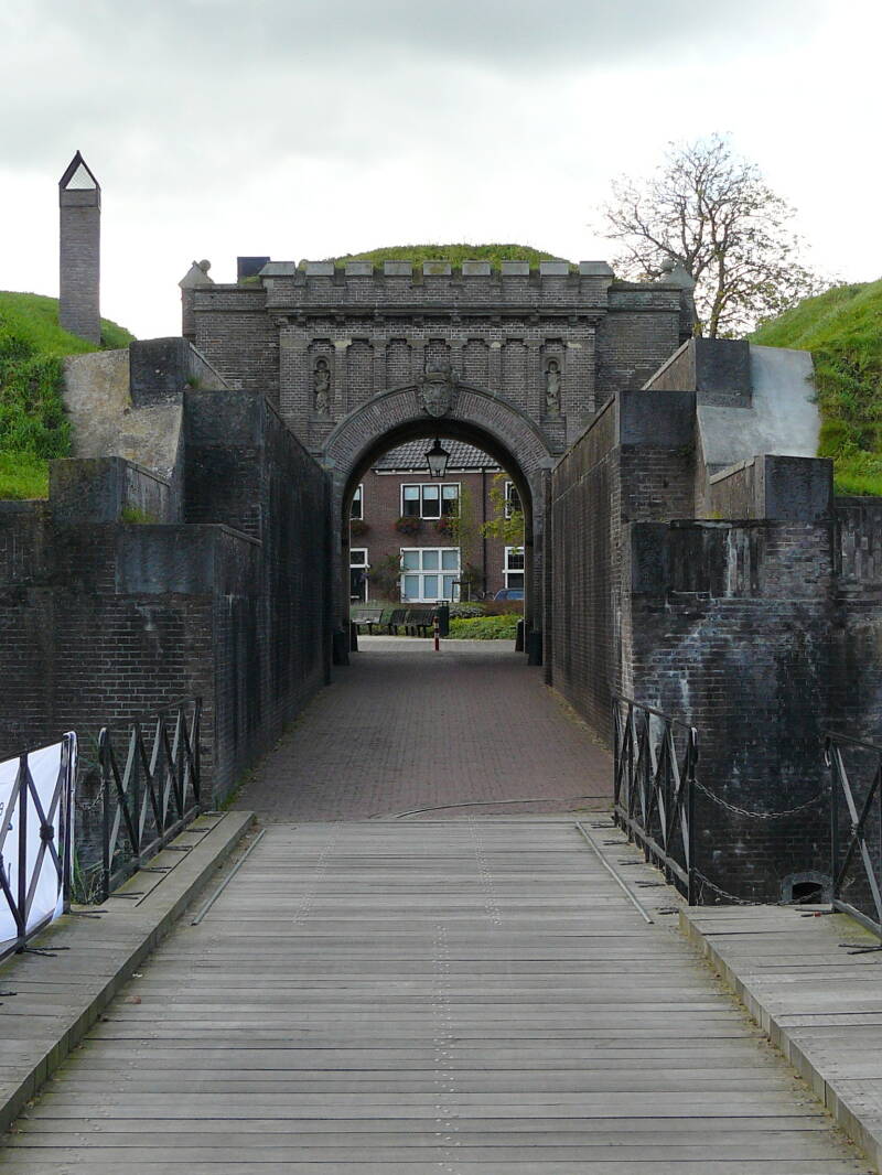 Boven de doorgang is in een nis een beeldje van de Nederlandse leeuw geplaatst, met in zijn poot een zwaard en in de andere een bundel met zeven pijlen. Links en rechts van de nis vormen muurankers het jaartal 1877. In de torentjes zijn afbeeldingen verwerkt van Koning Willem III en zijn eerste vrouw Sophie van Württemberg. Over de gracht voor de poort ligt nu een vaste brug, maar bij de bouw van het wachtgebouw lag hier een kraanbrug.
